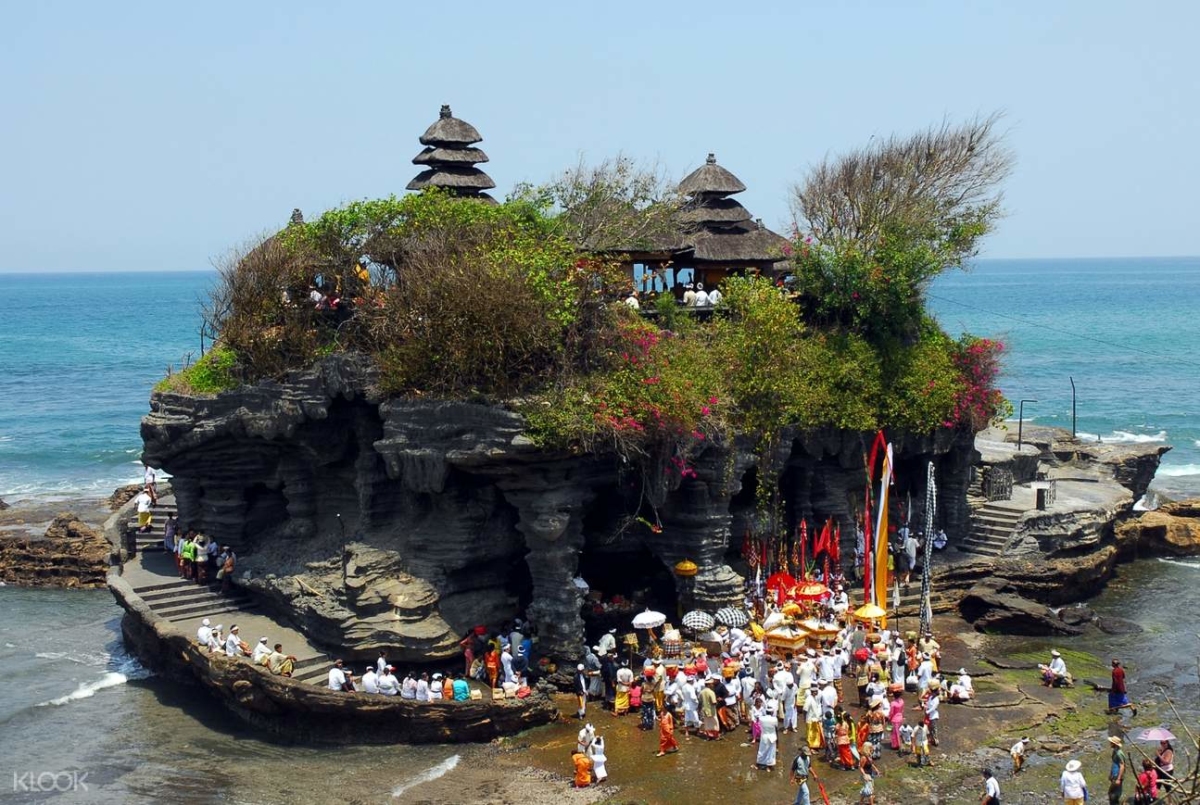 Đền Tanah Lot – được xây dựng trên một miệng núi lửa gồ ghề giữa biển. Tại đây Quý khách có thể ngắm hoàng hôn tuyệt đẹp.